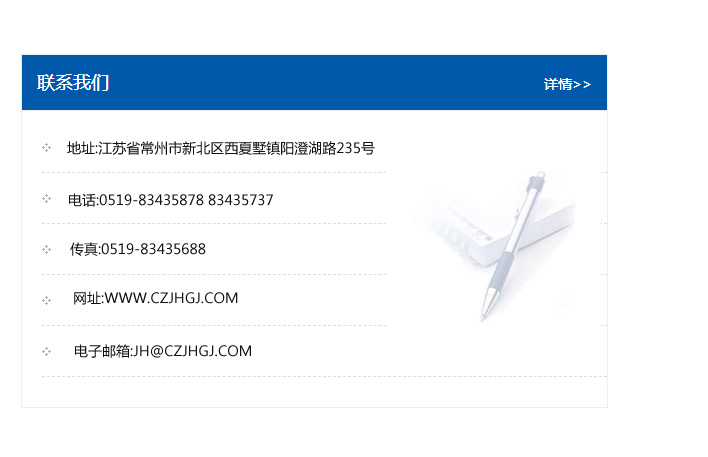 地址:常州市新北區友邦商務大廈1幢16、17層  電話:0519-85101652  傳真:0519-85112595  郵編:213022  網址:www_cz-jiayue_cn.tx-dy.com  郵箱:xiajifengaa@163.com